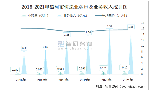 2016-2021年黑河市快遞業務量及業務收入統計圖