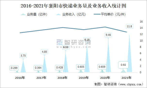 2016-2021年襄陽市快遞業務量及業務收入統計圖