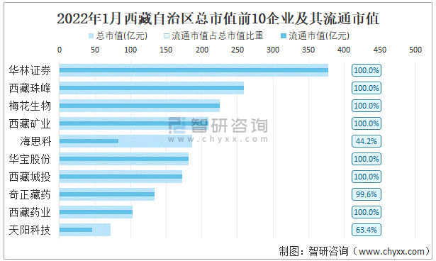 2022年1月西藏自治區(qū)A股上市總市值前10強企業(yè)及其流通市值