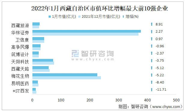 據(jù)同花順統(tǒng)計數(shù)據(jù)可知:相較于2021年12月,1月西藏自治區(qū)僅3家企業(yè)總市值環(huán)比增長,其增幅均低于10%,其中從事景點及旅游行業(yè)的西藏旅游增幅最大,增長8.91%,環(huán)比增幅最大的前10強企業(yè)中,從事證券行業(yè)的華林證券增量最大,總市值增加8.37億元;18家企業(yè)總市值環(huán)比出現(xiàn)下滑。