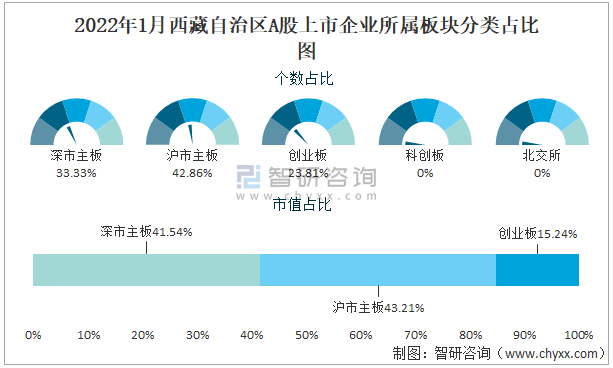 2022年1月西藏自治區(qū)A股上市企業(yè)所屬板塊分類占比圖