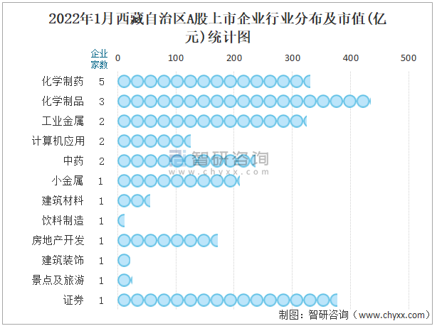 2022年1月西藏自治區(qū)A股上市企業(yè)行業(yè)分布及市值(億元)統(tǒng)計圖