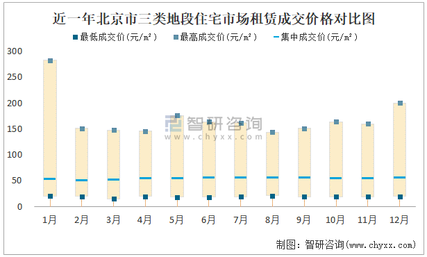 近一年北京市三類地段住宅市場租賃成交價格對比圖