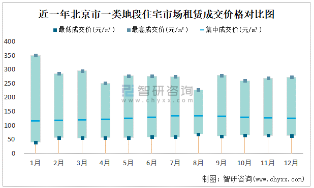 近一年北京市一類地段住宅市場租賃成交價格對比圖