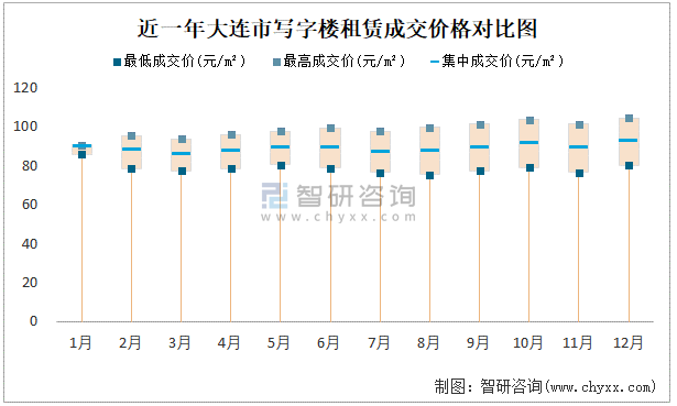 近一年大連市寫字樓租賃成交價格對比圖