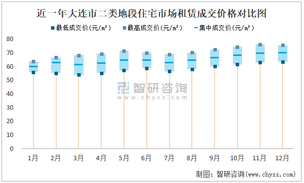 近一年大連市二類地段住宅市場租賃成交價格對比圖