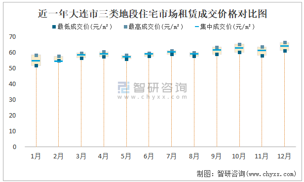 近一年大連市三類地段住宅市場租賃成交價格對比圖