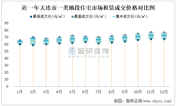 近一年大連市一類地段住宅市場租賃成交價格對比圖