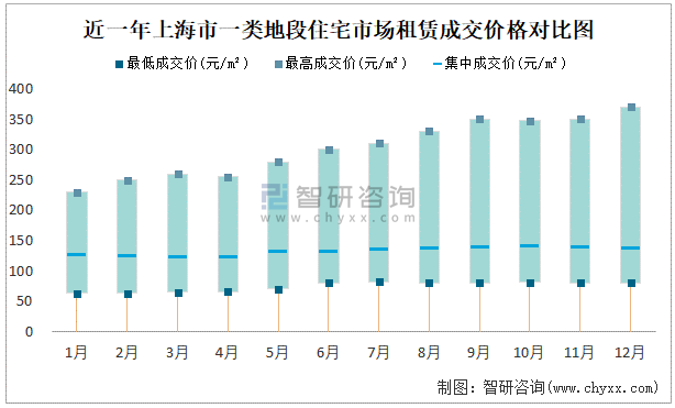 近一年上海市一類地段住宅市場租賃成交價格對比圖