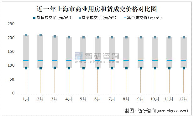 近一年上海市商業用房租賃成交價格對比圖