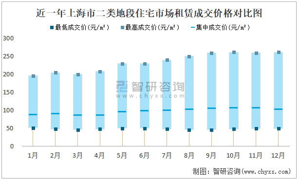 近一年上海市二類地段住宅市場租賃成交價格對比圖