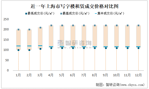 近一年上海市寫字樓租賃成交價格對比圖