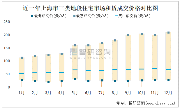 近一年上海市三類地段住宅市場租賃成交價格對比圖