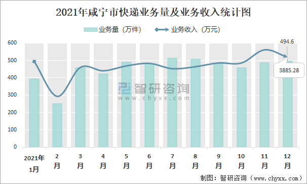 2021年咸寧市快遞業(yè)務(wù)量及業(yè)務(wù)收入統(tǒng)計(jì)圖