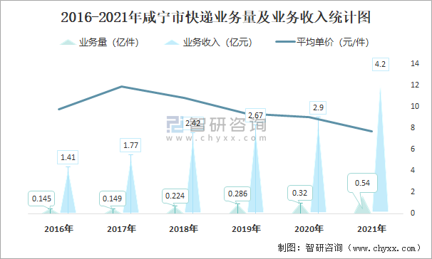 2016-2021年咸寧市快遞業(yè)務(wù)量及業(yè)務(wù)收入統(tǒng)計(jì)圖