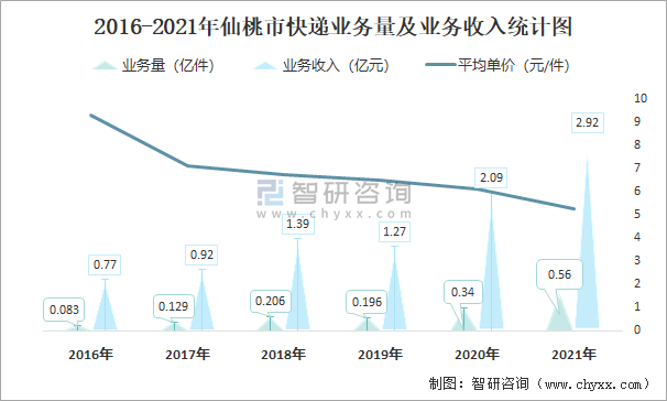 2016-2021年仙桃市快遞業務量及業務收入統計圖