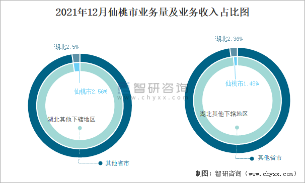 根據各省市郵政局數據可知:2021年12月仙桃市快遞業務量占湖北快遞業務量的2.56%,湖北快遞業務量占全國快遞業務量的2.5%;2021年12月仙桃市快遞業務收入占湖北快遞業務收入的1.48%,湖北快遞業務收入占全國快遞業務收入的2.36%。