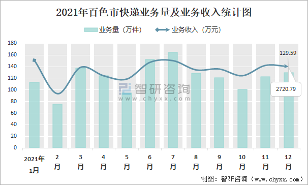 2021年12月百色市快遞業務量與業務收入分別為129.59萬件和2720.79萬元