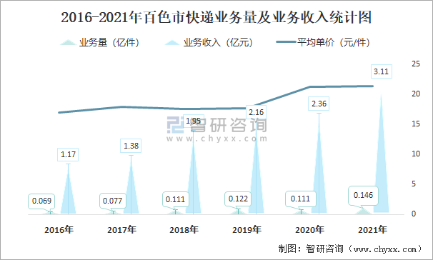 2016-2021年百色市快遞業務量及業務收入統計圖