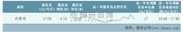 根據農村農業(yè)部數據統(tǒng)計可知:2022年第9周全國白條雞平均批發(fā)價為17.08元/公斤,同比下跌4.74%,環(huán)比下跌0.29%,近一年全國白條雞平均批發(fā)價最高達到17.95元/公斤,批發(fā)價最低也要16.46元/公斤。