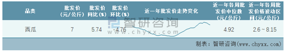 根據農村農業部數據統計可知:2022年第9周全國西瓜平均批發價為7元/公斤,同比增加5.74%,環比下跌4.76%,近一年全國西瓜平均批發價最高達到8.15元/公斤,批發價最低也要2.6元/公斤。