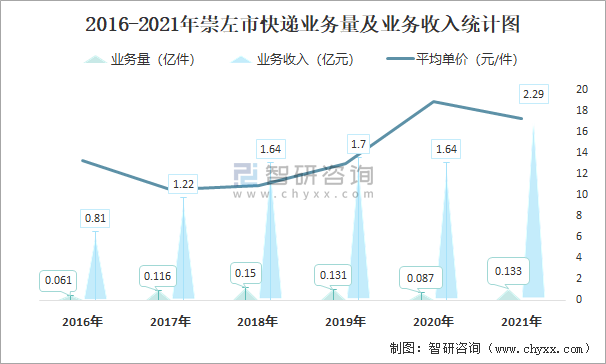 2016-2021年崇左市快遞業務量及業務收入統計圖