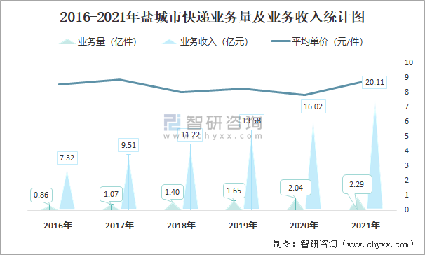 2016-2021年鹽城市快遞業務量及業務收入統計圖