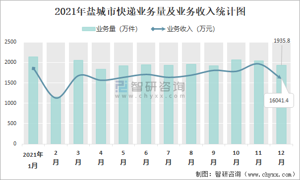 2021年12月鹽城市快遞業務量與業務收入分別為1935.8萬件和16041.4萬元