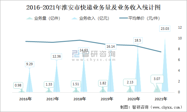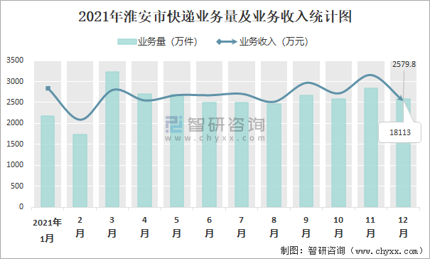 2021年淮安市快遞業務量及業務收入統計圖