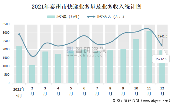 2021年泰州市快遞業務量及業務收入統計圖