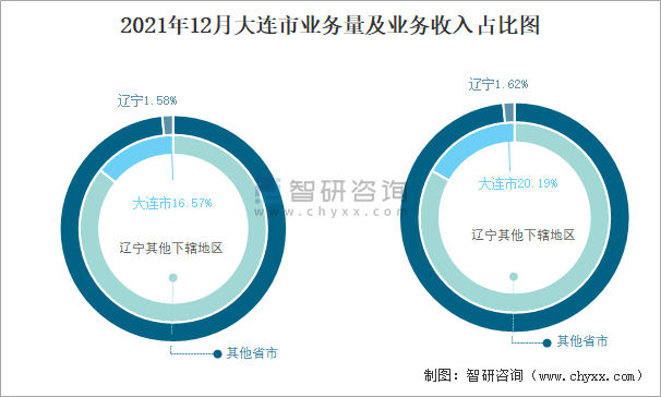 根據各省市郵政局數據可知:2021年12月大連市快遞業務量占遼寧快遞業務量的16.57%,遼寧快遞業務量占全國快遞業務量的1.58%;2021年12月大連市快遞業務收入占遼寧快遞業務收入的20.19%,遼寧快遞業務收入占全國快遞業務收入的1.62%。
