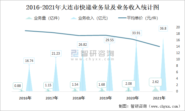 2016-2021年大連市快遞業務量及業務收入統計圖