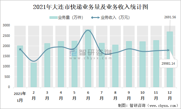 2021年12月大連市快遞業務量與業務收入分別為2691.56萬件和29981.14萬元