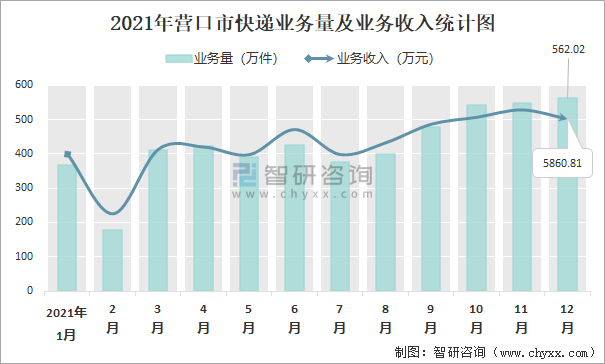 2021年營口市快遞業(yè)務(wù)量及業(yè)務(wù)收入統(tǒng)計圖