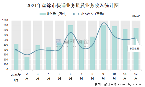 2021年盤錦市快遞業務量及業務收入統計圖