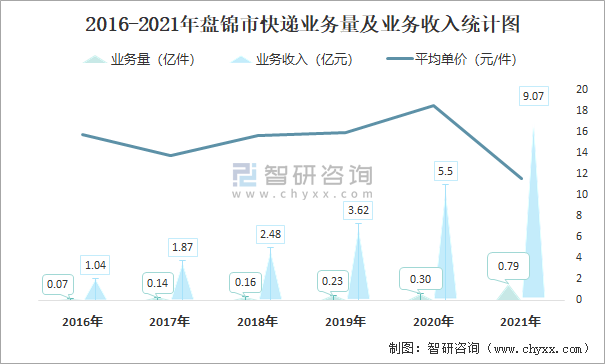 2016-2021年盤錦市快遞業務量及業務收入統計圖