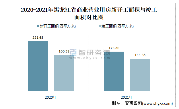 2020-2021年黑龍江省商業營業用房新開工面積與竣工面積對比圖
