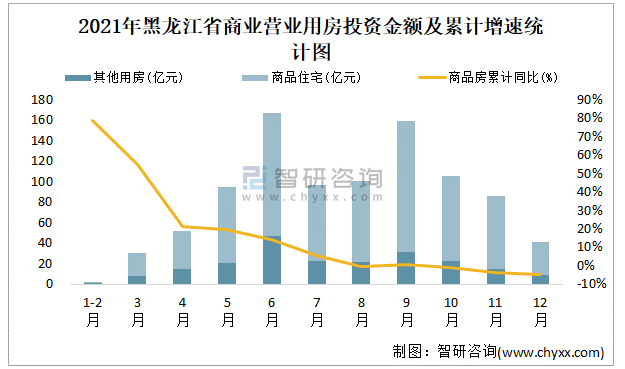 根據國家統計局數據統計可知:2021年12月黑龍江省房地產開發投資商品房投資金額為41.54億元,其中包括辦公樓、商業營業用房等其他用房9.29億元(注:辦公樓、商業營業用房未分開統計);2021年黑龍江省房地產開發投資包括商業營業用房在內的其他用房累計金額為211.92億元。