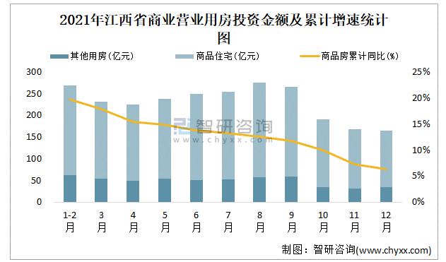 根據國家統計局數據統計可知:2021年12月江西省房地產開發投資商品房投資金額為164.72億元,其中包括辦公樓、商業營業用房等其他用房34.82億元(注:辦公樓、商業營業用房未分開統計);2021年江西省房地產開發投資包括商業營業用房在內的其他用房累計金額為533.89億元。