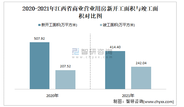 2020-2021年江西省商業營業用房新開工面積與竣工面積對比圖
