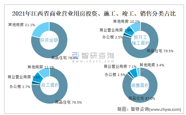 根據國家統計局數據統計可知:2021年江西省房地產開發企業在包括商業營業用房在內的其他用房投資金額占比為21.1%(注:只有投資金額中其他用房包含辦公樓、商業營業用房),商業營業用房的新開工面積與竣工面積所占比重差異不大,從銷售面積來看,商業營業用房銷售面積占比高于辦公樓銷售面積占比。