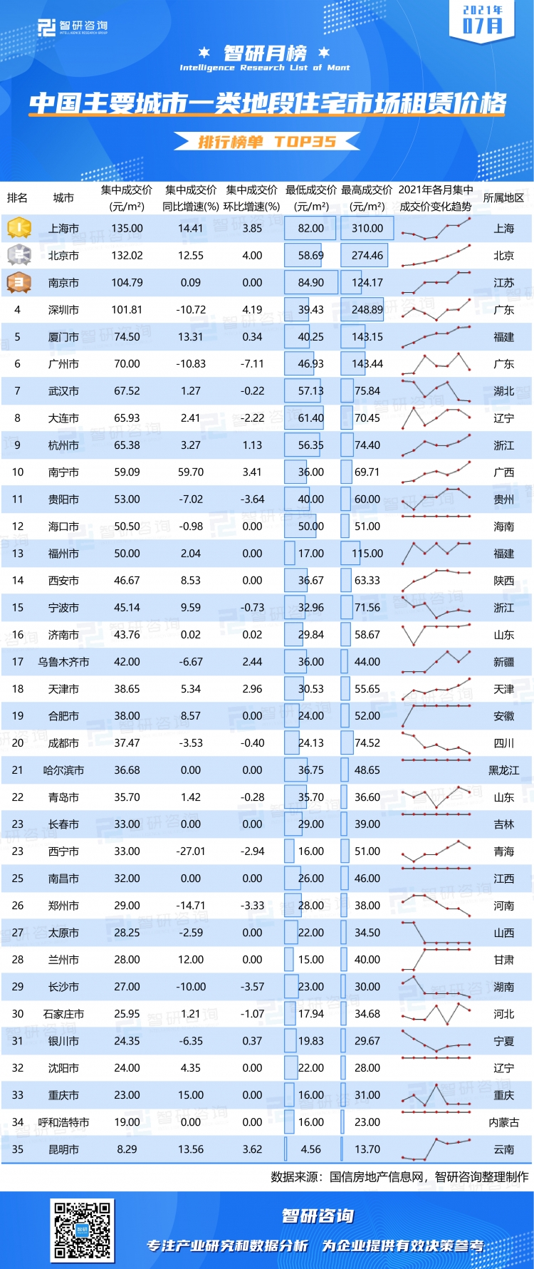 依據榜單可知:1)上海市、北京市、南京市、深圳市7月一類地段住宅市場租賃價格集中成交價均超過100元每平米,昆明市一類地段住宅市場租賃成交價最低,不足10元每平米;2)與2020年7月相比,20個城市一類地段住宅市場租賃成交價均呈現不同程度增加,南寧市增幅最大,哈爾濱市、長春市、南昌市、呼和浩特市無變化,11個城市有所下滑,西寧市下滑幅度最大;3)從35個城市一類地段住宅市場租賃成交價2021年各月的走勢可以看出,11個城市總體呈現上升趨勢,11個城市總體有所下滑,13個城市價格有一定變化,7月和6月的價格相比沒有變化;4)35個城市主要分布在30個省份,集中成交價排名前十的城市中,有2個在廣東。