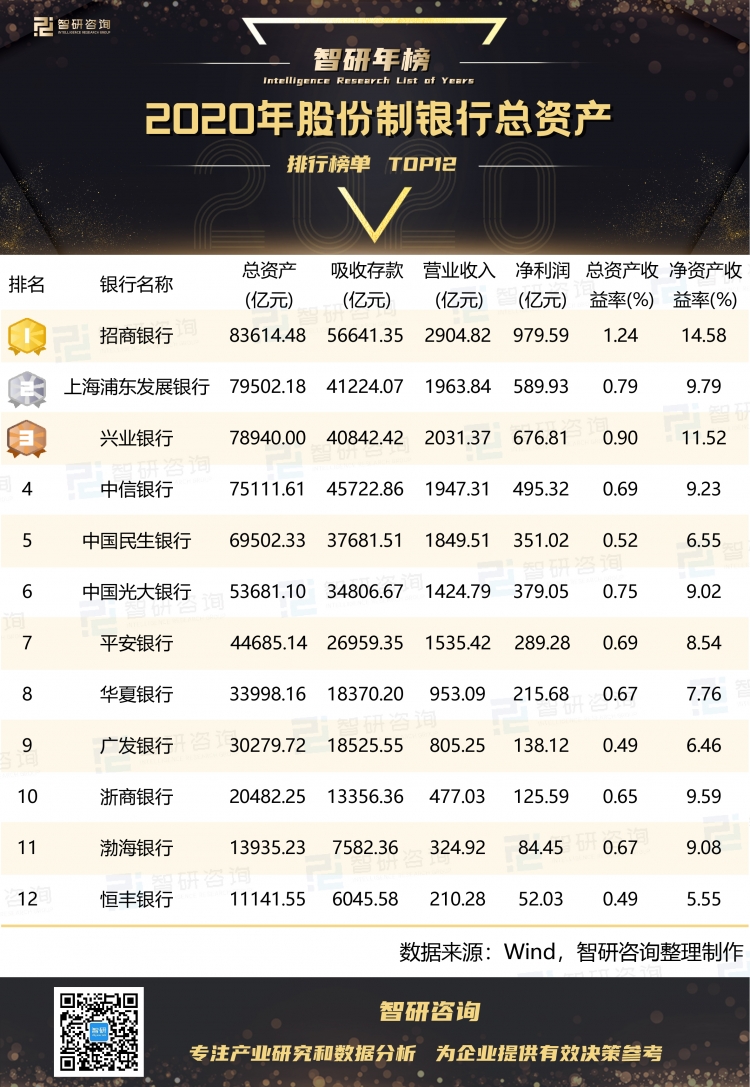 為研究2020年股份制銀行總資產情況,智研咨詢數據中心推出《智研年榜:2020年股份制銀行總資產排行榜單TOP12》,以供參考。