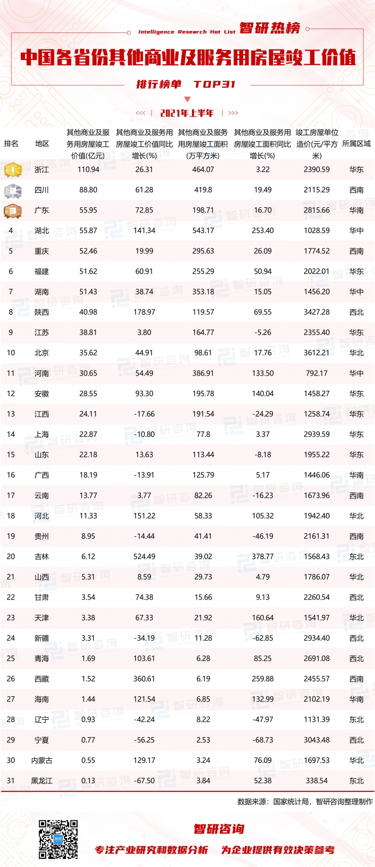 依據(jù)榜單可知,浙江以110.94億元的其他商業(yè)及服務(wù)用房屋竣工價值排名第一,遠遠超過其他省市的其他商業(yè)及服務(wù)用房屋竣工價值,排名第二的四川其他商業(yè)及服務(wù)用房屋竣工價值高達88.8億元;從其他商業(yè)及服務(wù)用房屋竣工價值的同比增長來看,有23個省市呈現(xiàn)出不同程度的增長,8個省市的的同比有所下降,吉林的其他商業(yè)及服務(wù)用房屋竣工價值的同比增長最快(524.49%),黑龍江的其他商業(yè)及服務(wù)用房屋竣工價值的同比下降最快,下降了67.5%。