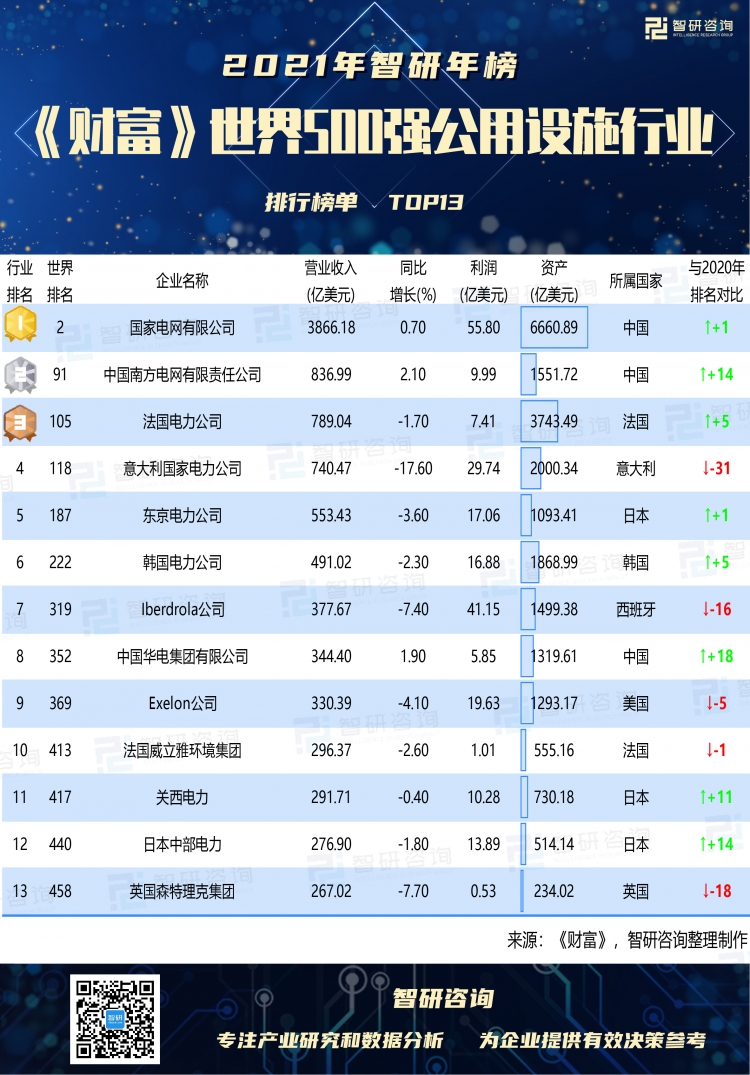 公用設施行業共有13家企業上榜,2020年營業收入共9461.59億美元,利潤盈利229億美元,相較于2020年,2021年《財富》世界500強公用設施行業8家企業排名上升,5家企業排名下降。