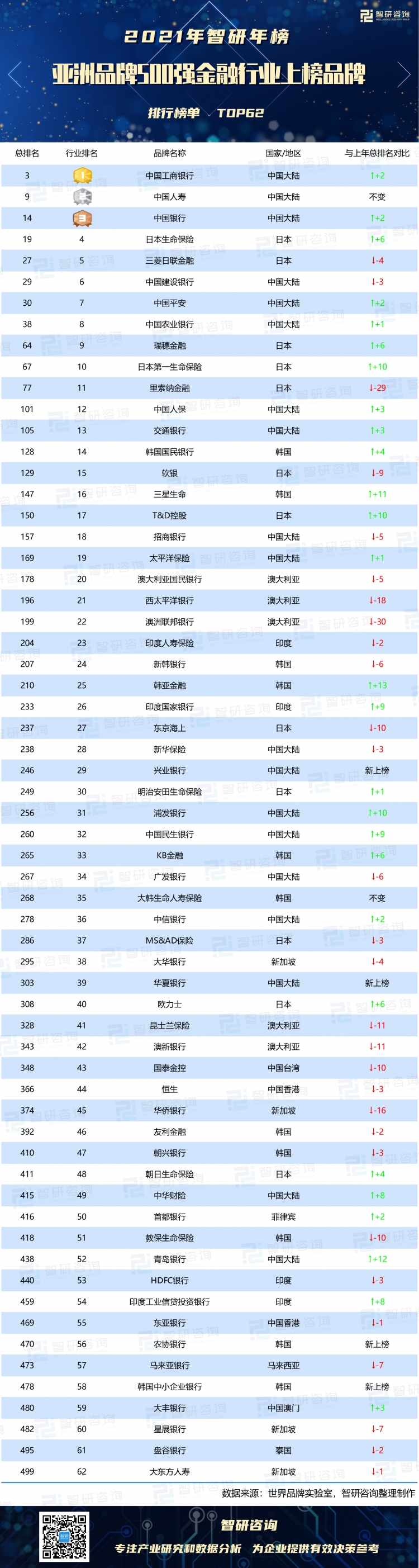 依據榜單可知:1)金融行業前三名均為中國品牌,其中中國工商銀行、中國人壽這2大金融品牌躋身進了總榜單前十;2)上榜的62個金融品牌,分布在12個國家和地區,中國有23個品牌上榜,其中中國大陸上榜19個,高于日本(12個)和韓國(11個);3)日本金融第一品牌日本生命保險,行業排名第4,總排名第19,韓國金融第一品牌韓國國民銀行,行業排名第14,總排名TOP128;4)與2020年金融行業上榜的亞洲品牌相比,興業銀行、華夏銀行、農協銀行、韓國中小企業銀行這4個品牌新上榜,2個品牌排名保持不變,27個品牌排名有所上升,韓亞金融上升了13個名次,29個品牌排名有所下滑,澳洲聯邦銀行下滑名次最多;5)2020年上榜的4個金融亞洲品牌,本次止步于500強,它們分別是:兆豐金控(中國臺灣)、中國大地保險(中國大陸)、Axis銀行(印度)、麥格理(澳大利亞)。