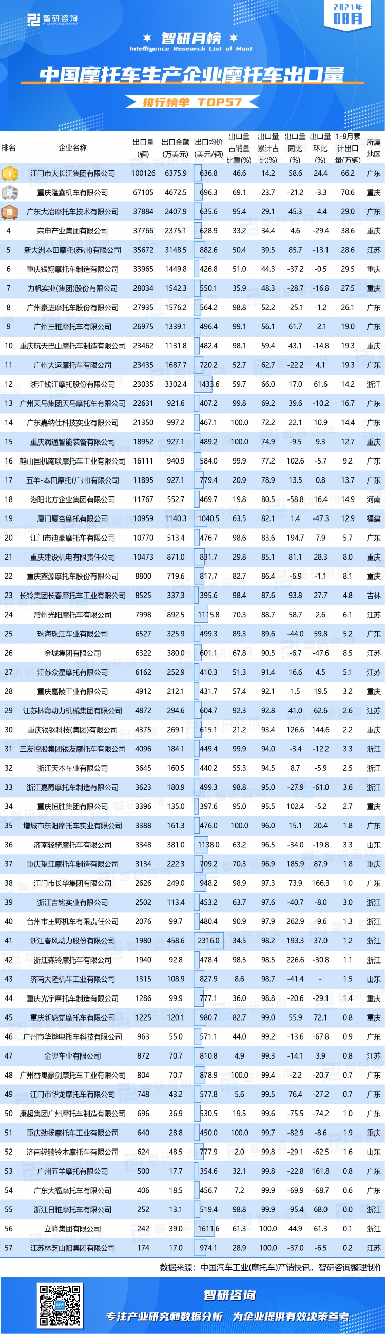 57家車企分布在全國8個省份,其中廣東、重慶和浙江這3個身份的車企數目最多,浙江車企數目高于江蘇,但其出口量少于江蘇摩托車出口量。
