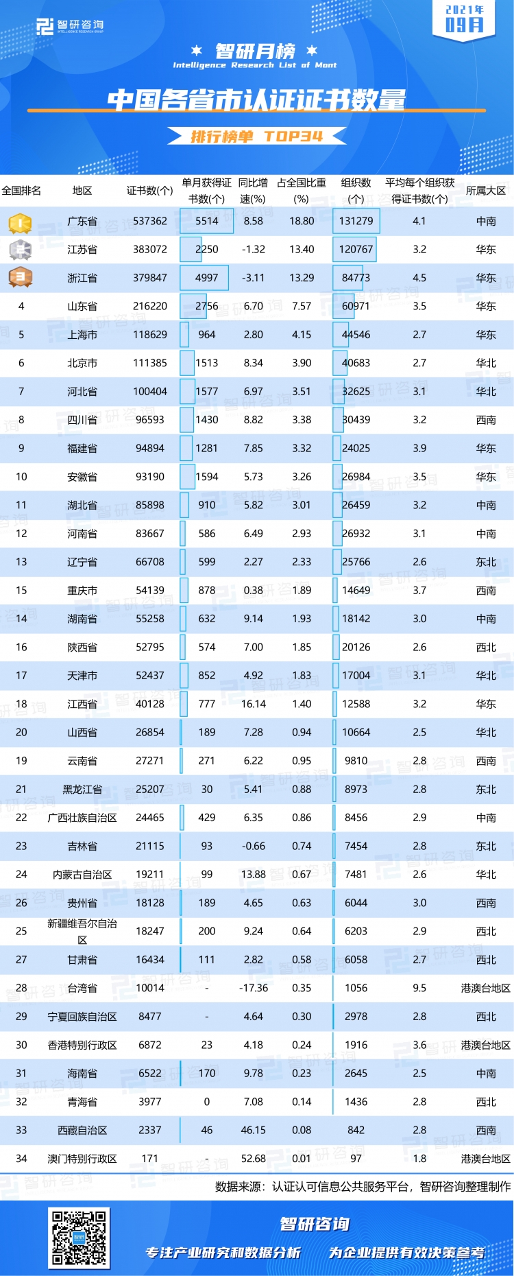 依據(jù)榜單可知,2021年1-9月廣東省證書數(shù)以超過50萬的成績位居榜單,占全國比重為18.80%,top2和top31-9月證書數(shù)相差不大,2021年9月共有7個(gè)省市累計(jì)證書數(shù)超過10萬,澳門特別行政區(qū)證書數(shù)低于200個(gè);就9月單月各省市獲得證書數(shù)來看,廣東省排名第一,江蘇省累計(jì)證書數(shù)大于浙江省,但其單月證書數(shù)遠(yuǎn)低于浙江省,9個(gè)省市證書數(shù)超過1000個(gè),青海省9月沒有獲得證書數(shù)。