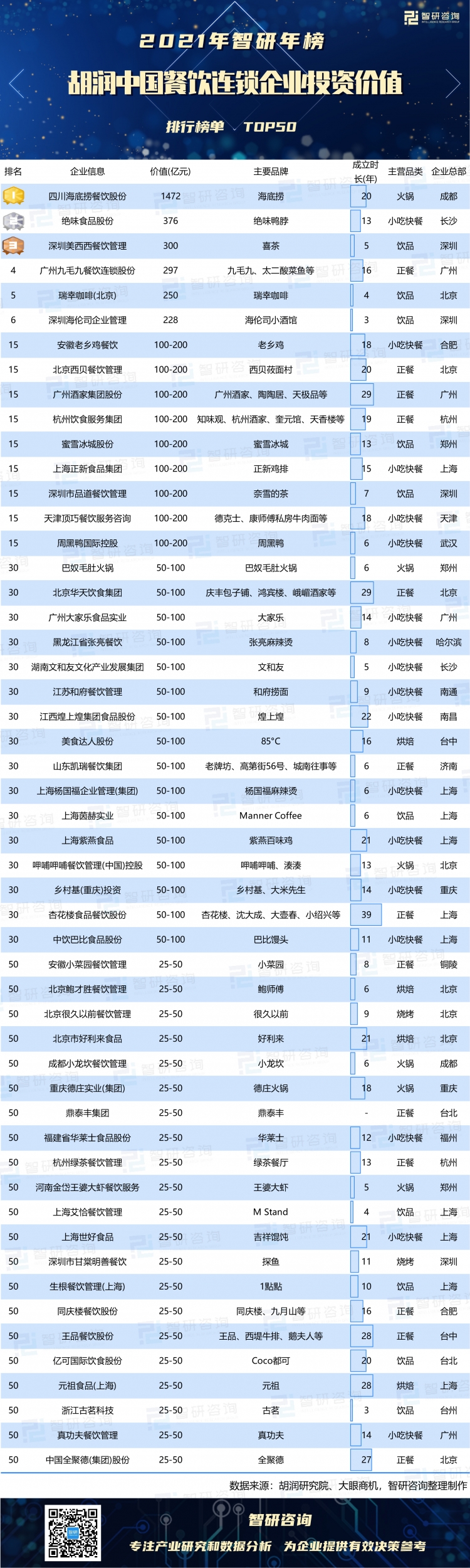 胡潤研究院攜手大眼商機聯合發布《2021大眼商機·胡潤中國餐飲連鎖企業投資價值榜TOP50》,這是胡潤研究院首次發布餐飲連鎖行業榜單,榜單按照企業市值或估值進行排名(上市公司市值按照2021年7月30日的收盤價計算,非上市公司估值參考同行業上市公司或者根據最新一輪融資情況進行估算),智研咨詢數據中心推出《智研年榜:2021年胡潤中國餐飲連鎖企業投資價值排行榜單TOP50》,以供參考。