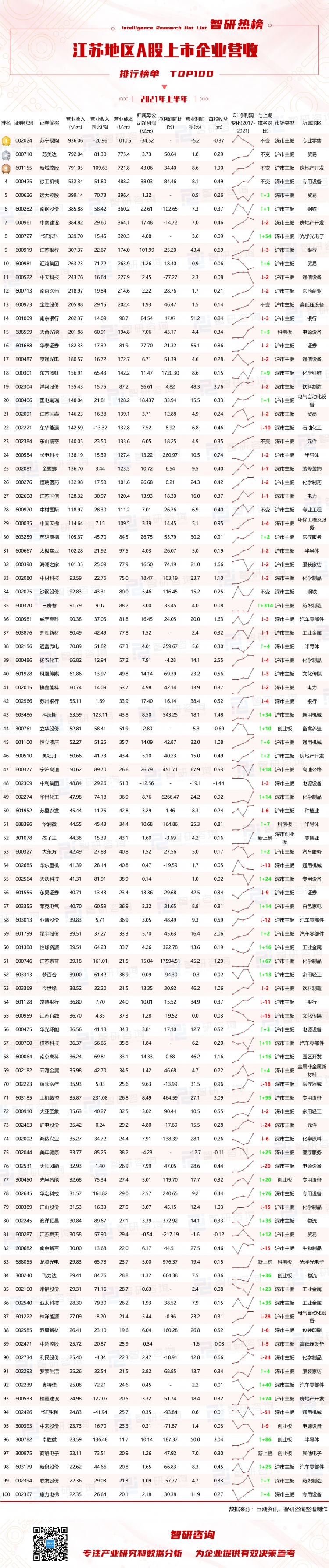 2021年上半年江蘇地區共有542家(截至2021年10月20日)A股上市企業披露半年報,總計營收14717.7億元,同比上升了34.57%(2020年上半年江蘇地區共有505家),總計歸屬母公司凈利潤為1299.91億元,同比上升了35.95%;542家上市企業所屬行業主要分布于化學制品(43家)、專用設備(37家)、汽車零部件(31家)、通用機械(31家)、半導體(18家);2021年4月6日深交所主板與中小板合并正式實施,因此以下深市中小板改為深市主板,江蘇地區542家上市企業有滬市主板(202家)、創業板(129家)、深市主板(128家)。現就江蘇地區上市企業前100名解讀如下: